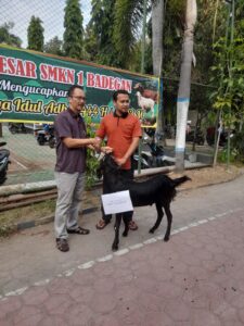 Penyembelihan hewan qurban tersebut dimulai pada pukul 07:00 WIB, dan bertempat di halaman parkir. Adapun proses penyembelihan dan pembagian daging qurban ini dilaksanakan oleh seluruh pegawai SMKN 1 Badegan. Setelah dilakukan penyembelihan oleh panitia qurban, selanjutnya daging hewan qurban didistribusikan kepada siswa penerima dan warga sekitar SMKN 1 Badegan. Melalui kegiatan berqurban ini, diharapkan dapat mengingatkan kita untuk selalu bersyukur dan bersedekah atas limpahan rezeki dari Allah SWT, dengan berqurban diharapkan menjadi penyemangat dalam membantu sesama, dan bergotong royong.