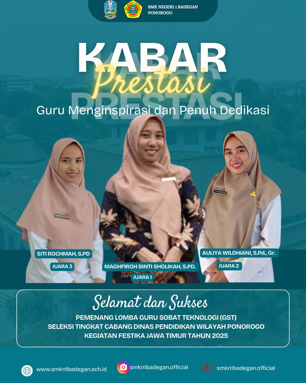 Selamat datang di portal berita SMKN 1 Badegan! Kami bangga mengumumkan bahwa tiga guru inspiratif kami telah menorehkan prestasi gemilang dalam ajang Lomba Guru Sobat Teknologi (GST) tingkat Cabang Dinas Pendidikan Wilayah Ponorogo. Prestasi ini sekaligus mengantarkan mereka mewakili Ponorogo ke FESTIKA Jawa Timur 2025, sebuah pencapaian yang membanggakan bagi seluruh civitas akademika!